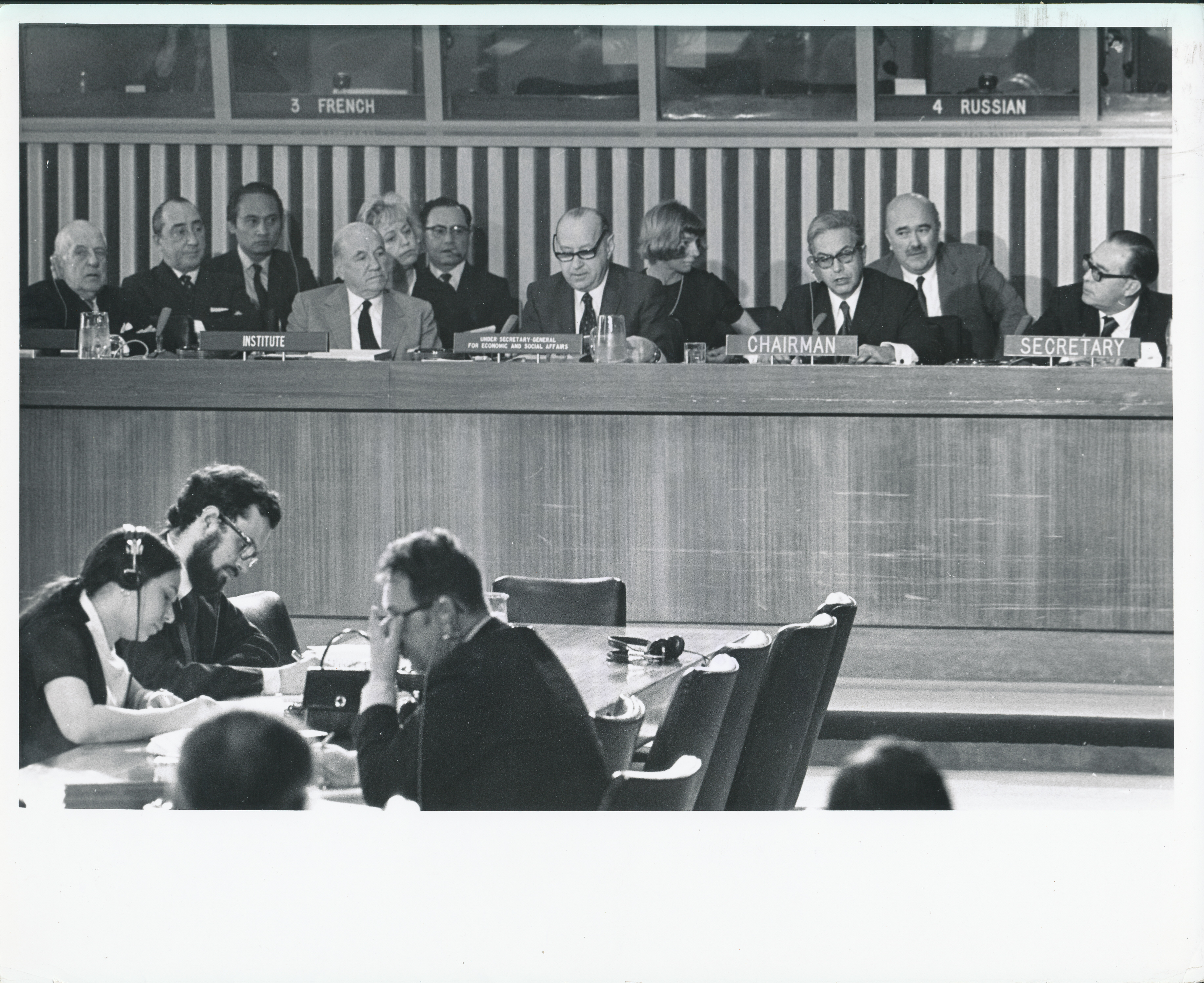 Carlos Quintana y Raúl Prebisch comparten la testera en la Quinta reunión extraordinaria del Comité Plenario de la CEPAL [fotografía]