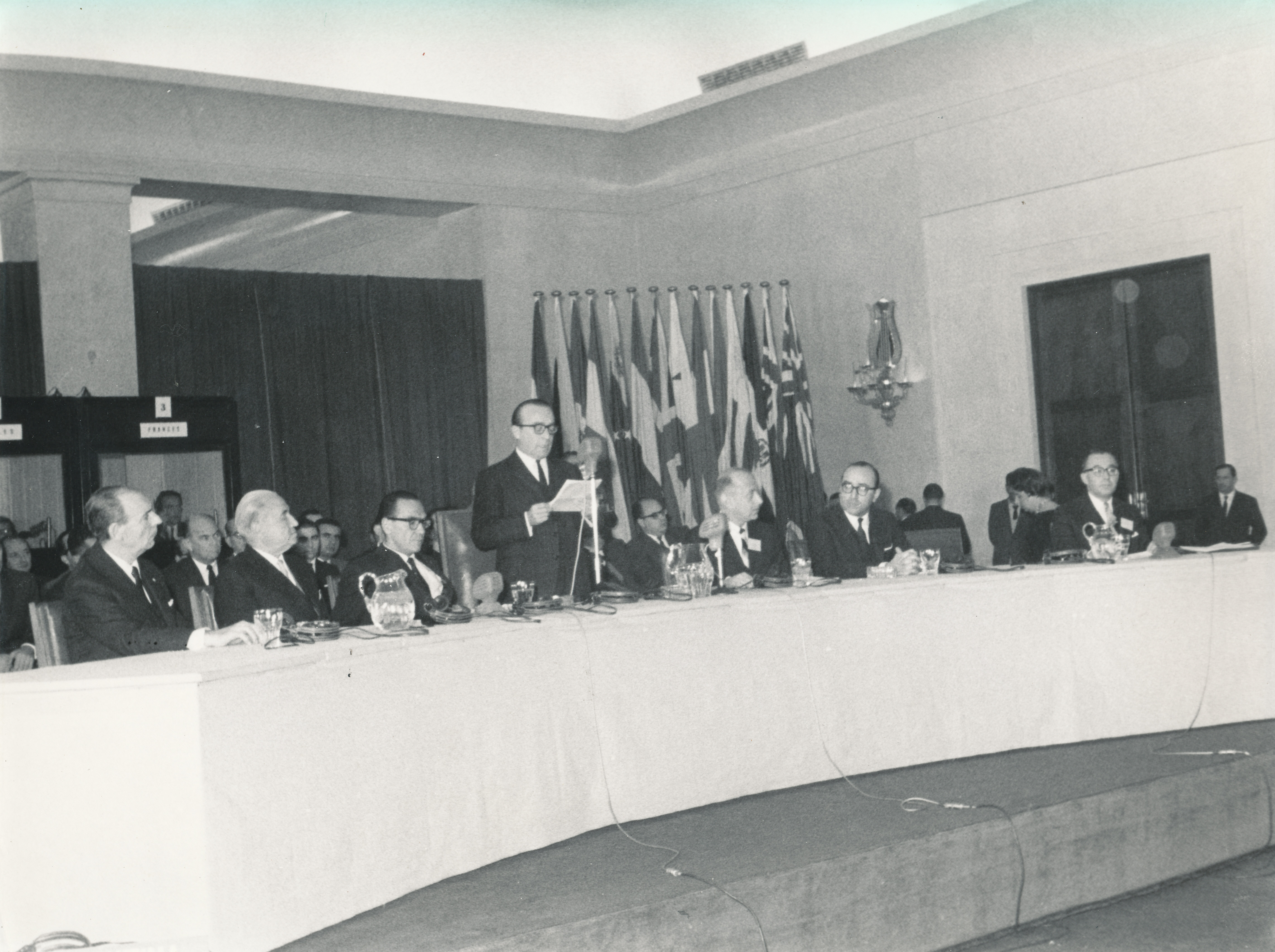 | dc.description.abstract | Segundo e izquierda a derecha: Raúl Prebisch sentado en la testera mientra otra autoridad hace uso de la palabra en una reunión no identificada (ca. 1970). |
