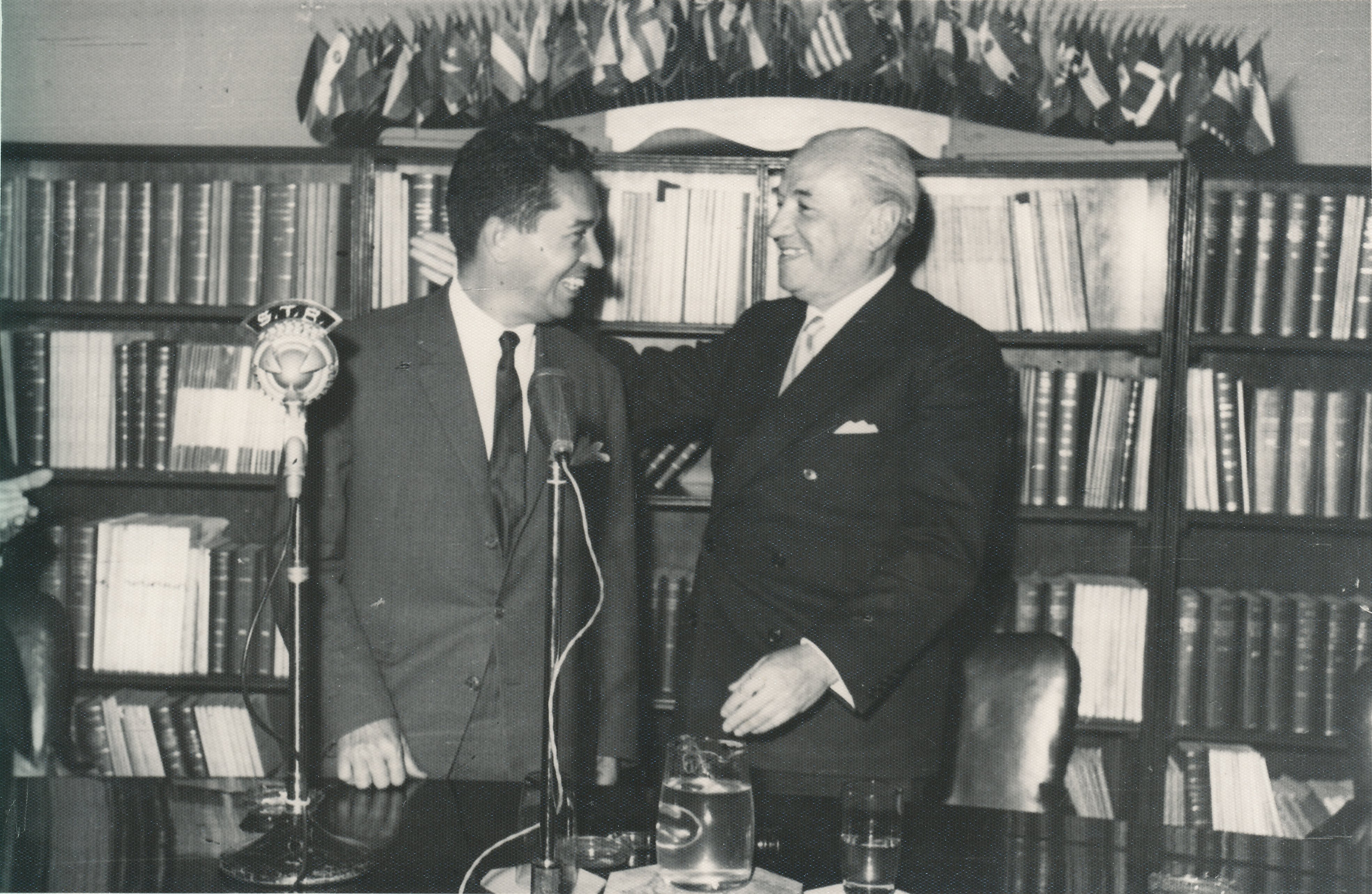 Raúl Prebisch saluda a José Antonio Mayobre quien asume el puesto de Secretario Ejecutivo de la CEPAL [fotografía]